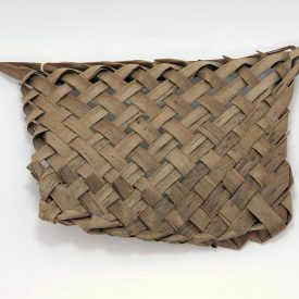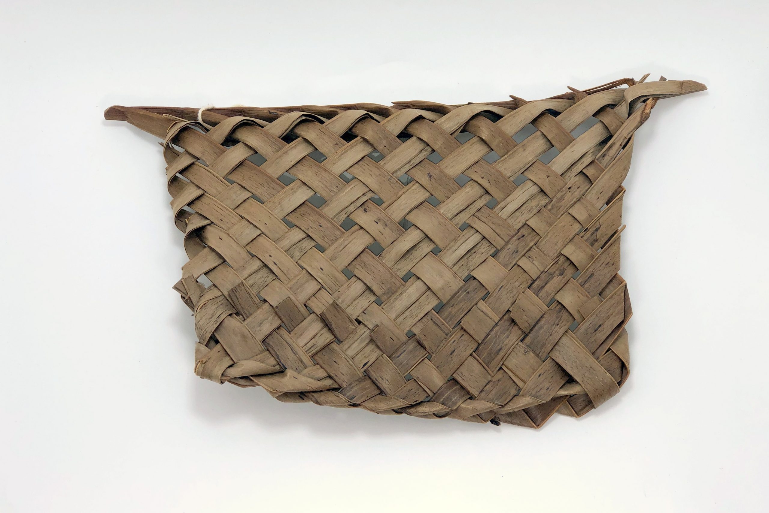 Indicação Biocultural: O coqueiro (Cocos nucifera L., família Arecaceae) tem indicação de origem no Sudeste Asiático, principalmente nas ilhas entre os oceanos Índico e Pacífico. No Brasil, as evidências históricas indicam que o coqueiro foi introduzido em 1553 pelos portugueses, predominantemente no litoral do Nordeste. O coqueiro é uma planta com uma ampla importância econômica e social em diversos países. A abundância de produtos que podem ser adquiridos dessa planta faz com que seja nomeada como árvore da vida. Seus usos se reportam principalmente, à produção de albúmen sólido, óleo de coco, farinha de coco, água de coco, fibras e ração animal. Na produção de fibras pode-se produzir a partir das folhas, fios e cordas altamente resistentes, que passam por um processo artesanal de separação, secagem e tecelagem, para que sejam feitos abanos, tapetes, sacolas, chapéus, vassouras, espanadores etc. O abano desta coleção foi feito artesanalmente e obtido na Comunidade Reserva Extrativista Marinha de Soure, no Pará.