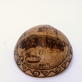 Indicação Biocultural: A cuieira é uma espécie é típica da América Central, mas pode ser encontrada também na região amazônica, Nordeste, Sudeste e Sul do Brasil. Os frutos são utilizados na fabricação de cuias que servem como utensílios domésticos, instrumentos musicais (berimbau e chocalhos) e objetos de decoração. A polpa do fruto, quando verde, possui propriedades anti-inflamatórias, antioxidante e antimicrobianas, sendo aplicada na medicina popular no combate a doenças respiratórias, hipertensão, diabetes, problemas urinários; quando madura, a polpa é considerada fitotóxica e pode ser abortiva; as sementes ainda apresentam propriedades diurética e purgativa. Esta cuia pirografada (pirografia é a arte de decorar madeira ou outros materiais com marcas de queimadura resultantes da aplicação controlada de um objeto aquecido) foi produzida por Bruno Rossi Santos (Associação Educativa, Rural e Artesanal da Vila De Joanes - AERAJ), para uso ornamental e utensílio doméstico.