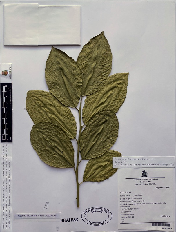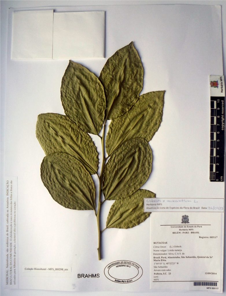 Indicação Biocultural: Citrus x aurantium L É uma espécie híbrida, naturalizada, não endêmica do Brasil e cultivada principalmente na região amazônica, sendo bem conhecida como “Laranja da Terra”, “Limão Turanju” e “Tangerina”. Assim como as demais espécies do gênero Citrus detém elevada quantidade de ácido ascórbico, além de ser possível extrair óleo essencial de suas folhas. Os principais componentes localizados no seu óleo essencial são: γ-terpeno, timol, linalol, acetato de linalila, sabineno e β-pineno, os quais auxiliam em sua ação medicinal contra gripes e resfriados, além de outros tratamentos. Com base em seus conhecimentos empíricos a Comunidade Rio Urubueua de Fátima, Abaetetuba, PA mais recomenda o chá/decocção e suco in natura das folhas e frutos para albumina de gestação, colesterol alto e problemas no coração.